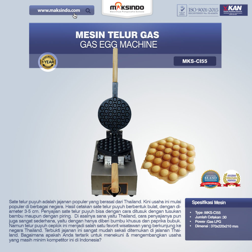Mesin Telur Gas (Gas Egg Machine) MKS-CI55 Sate telur puyuh adalah jajanan populer yang berasal dari Thailand. Kini usaha ini