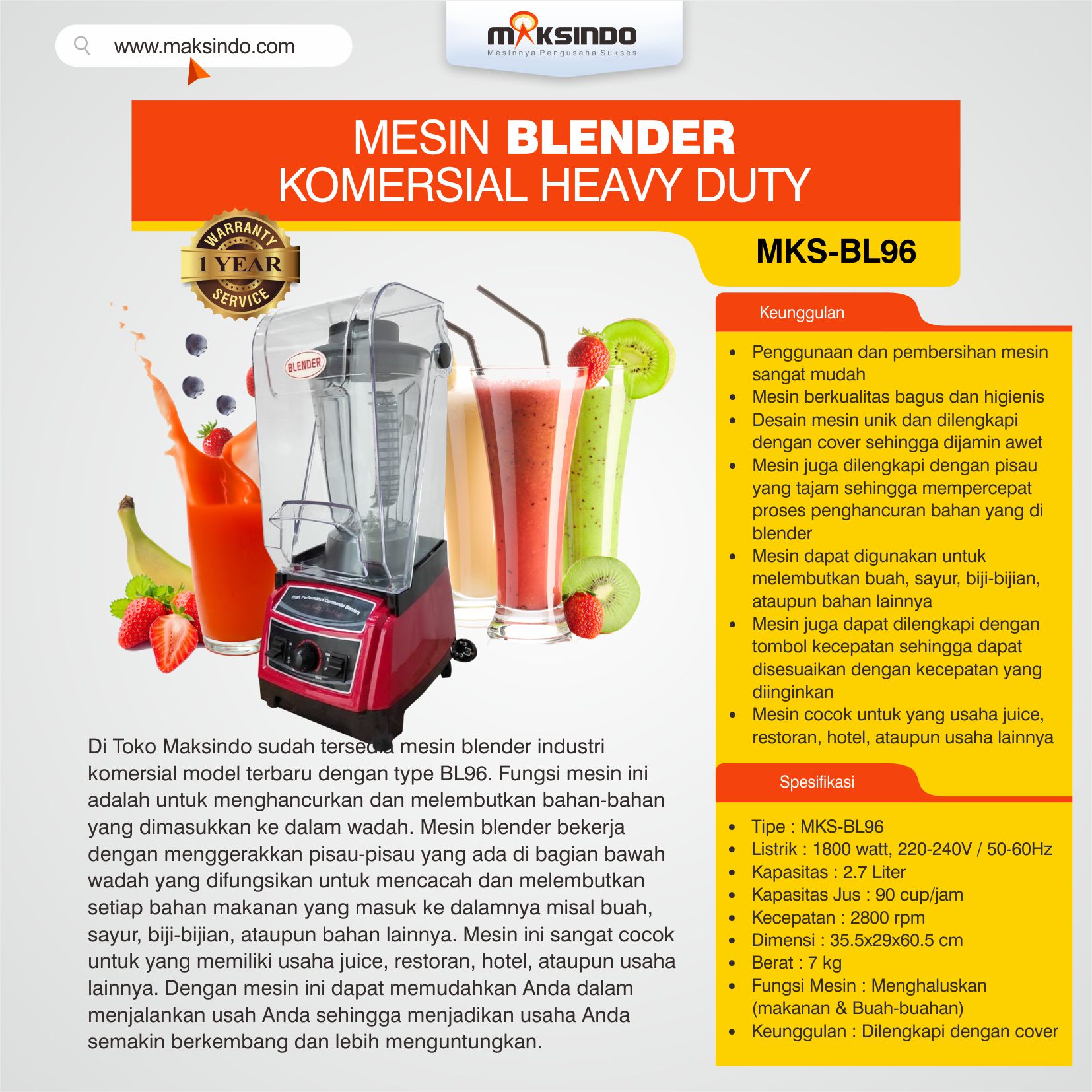 Mesin Blender Komersial Heavy Duty MKS-BL96 Maksindo beserta dengan 10 keunggulan unggul yang dimilikinya.